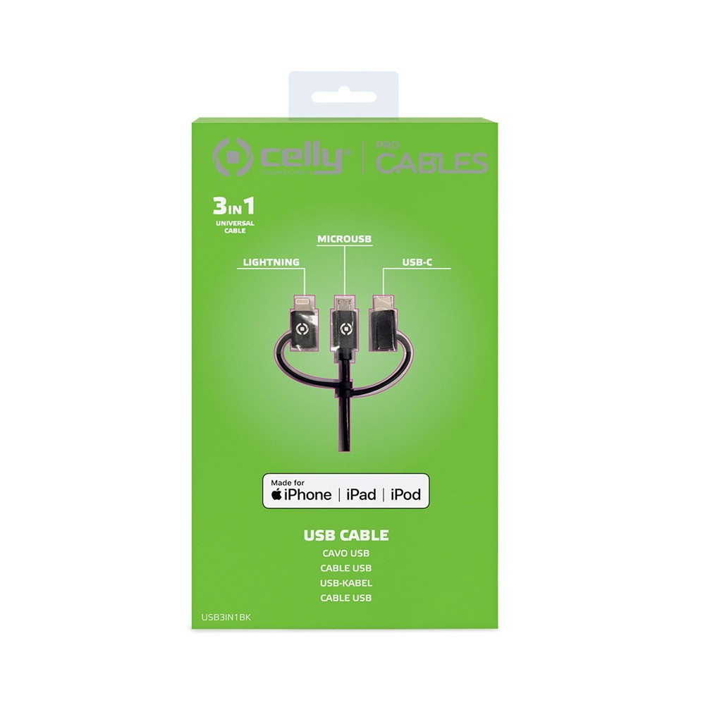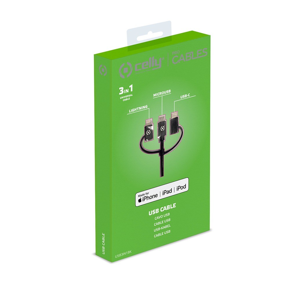 3-i-1 universalkabel med Micro USB og adaptere for Lightning (MFI) og USB-B.