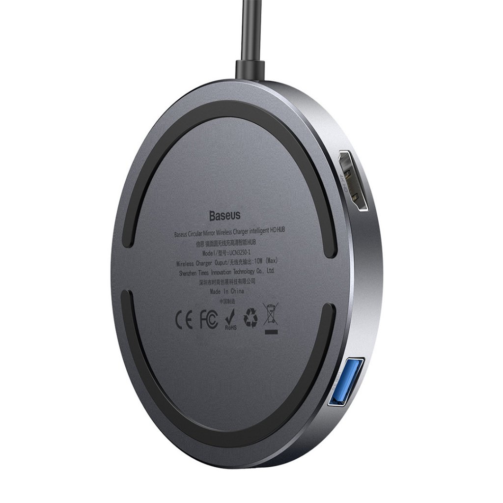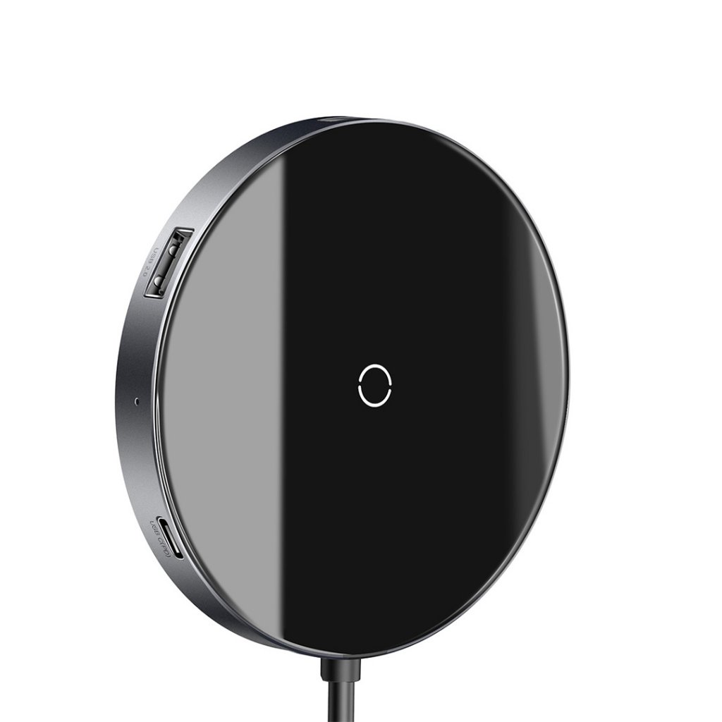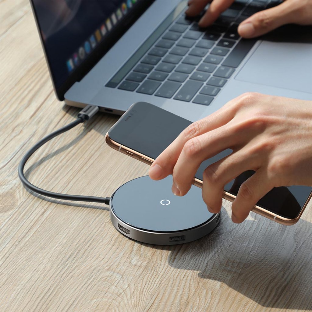 Dette lille og kompakte laderen har en type-C, seks-i-en lader med 4K/HD videogrensesnitt som er praktisk å bære med seg eller på reiser. Den er laget av holdbar aluminiumslegering og herdet glass som sikrer lav temperatur, rask lading og god varmeavledning. Den har også en sklisikker gummipakning i bunnen som forhindrer at mobilen din beveger seg ved vibrasjoner når noen ringer, sklisikringen er også en beskyttelse for mobilen din.