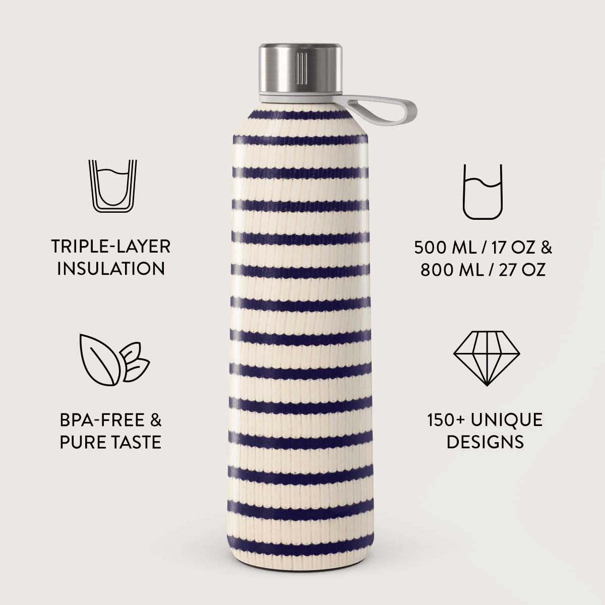 Velg blant et bredt utvalg av eksklusive BURGA-designer, der hver flaske kombineres med ett av tre stilige lokk i rustfritt stål: gunmetal, roségull eller sølv. Vårt team velger nøye riktig kork til hvert design – resultatet er alltid en flaske med sømløs, enhetlig stil.