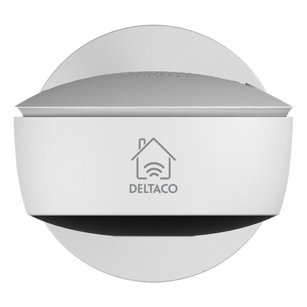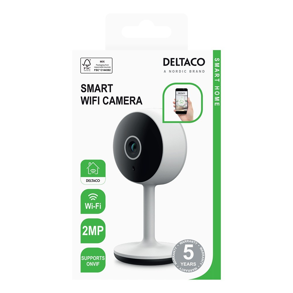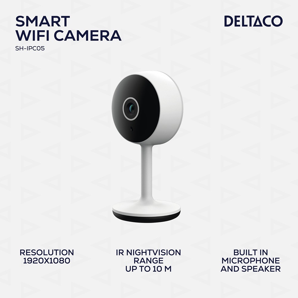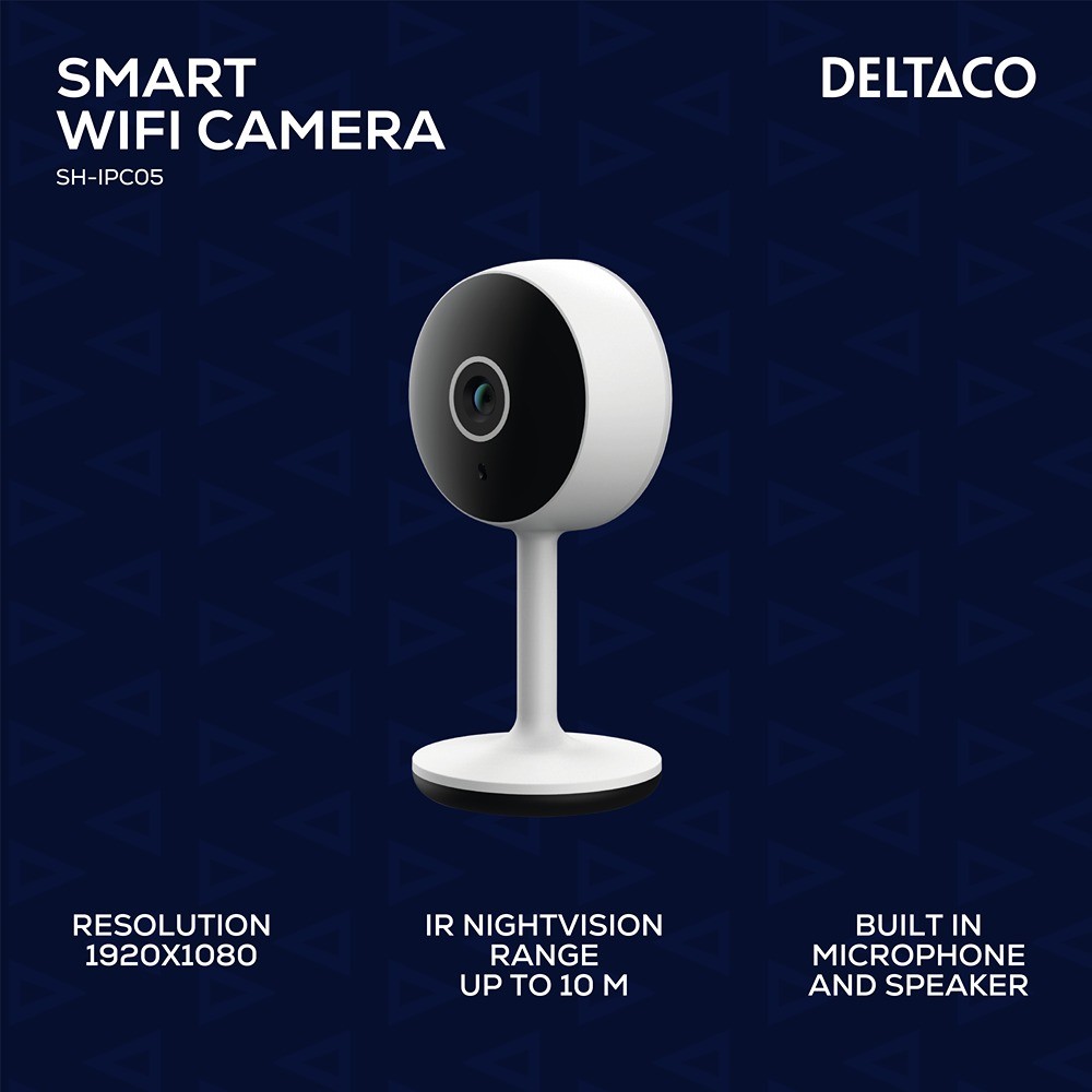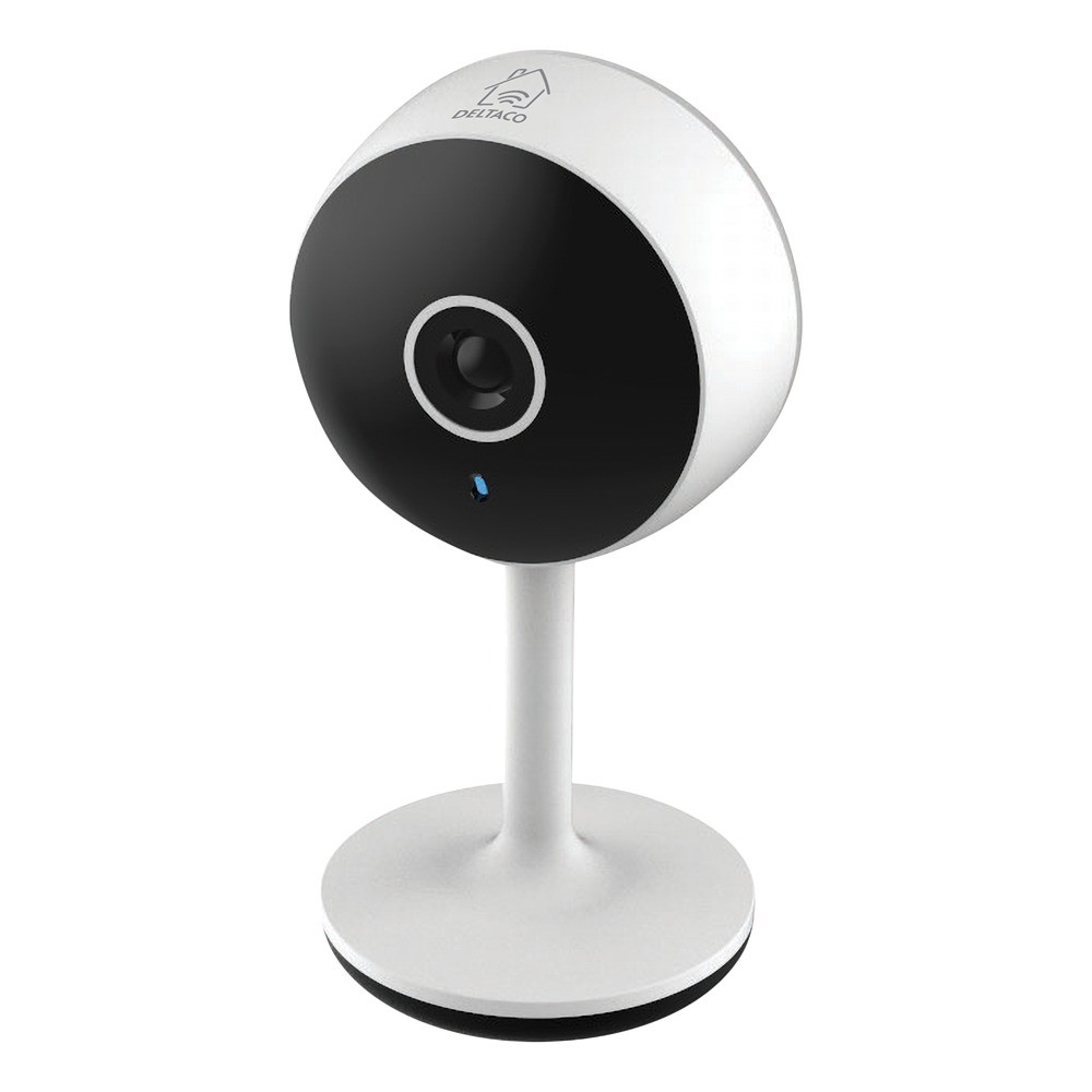 Smart WiFi-kamera med 1920x1080 (2MP) oppløsning, IR nattsyn opptil 10 meter, og bevegelsesdeteksjon med automatiske varsler. Kameraet drives via USB-C og kobles til via 2,4 GHz Wi-Fi. Det inkluderer en høyttaler og mikrofon for jevn toveis kommunikasjon gjennom Deltaco Smart Home-appen og støtter MicroSD-kort opptil 128 GB.