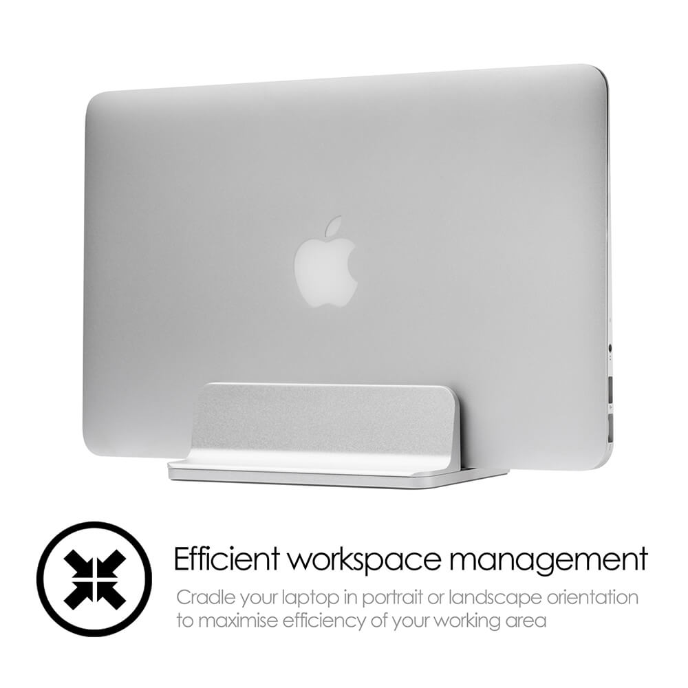 DESIRE2 Bordstativ for Mac/Ultrabooks presenteres i en elegant finish av raffinert aluminium. Med en dedikert støtte for din bærbare datamaskin kan du montere den vertikalt eller horisontalt, med fullt justerbare innstillinger for ulike tykkelser på bærbare datamaskiner fra 0,55 til 2,58 tommer (passer de fleste bærbare datamaskiner fra Apple, Dell, HP og Samsung), og silikongummiføtter gir enheten din et sikkert grep på hvilken som helst bordflate.