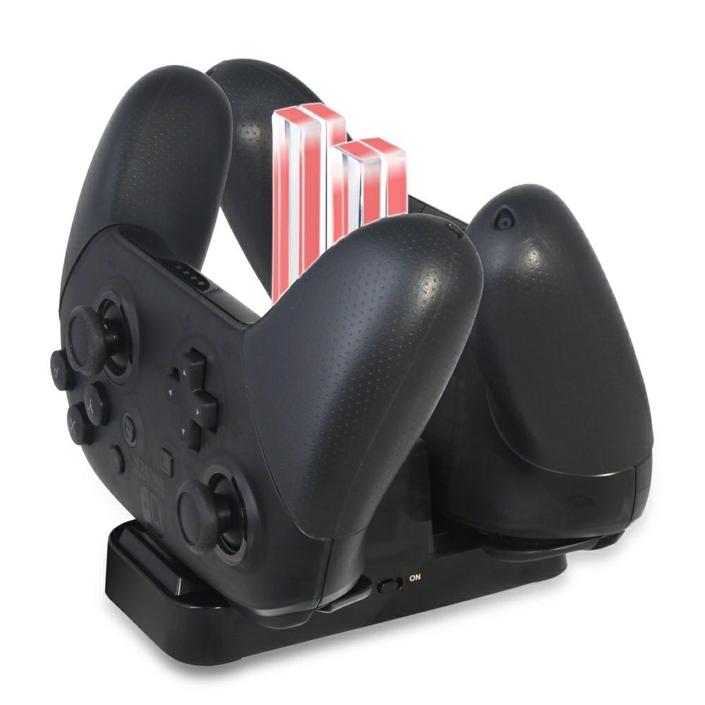 Ladestasjon for Nintendo Switch Joy-con Pro spilltilbehør. Intelligent styringskretsutgang, støtter lading av 4 Joy-con-kontrollere samtidig, rødt lys under lading, grønt lys når fulladet. Den kan lade 2 Joy-con-kontrollere og 1 Switch Pro-kontroller, eller 2 Switch Pro-kontrollere samtidig. Bruk den originale strømadapteren (ikke inkludert) ved lading.