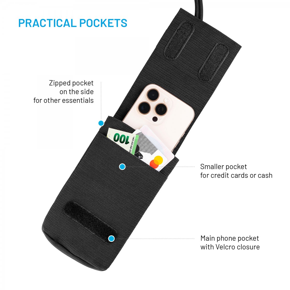 Hovedrommet rommer en mobiltelefon på opptil 7 tommer og er beskyttet av et klaff med et borrelås-lukkemekanisme sammen med frontlommen.
