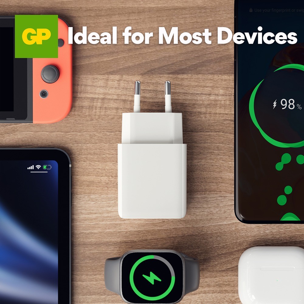 GP 20 W PD lader lader mer enn tre ganger raskere enn standardladere og kan lade telefonen din til 50% på bare 30 minutter. USB-C- og USB-A-portene gjør at du kan lade to enheter samtidig. De mange sikkerhetsfunksjonene forhindrer overspenning, overstrøm og kortslutning.