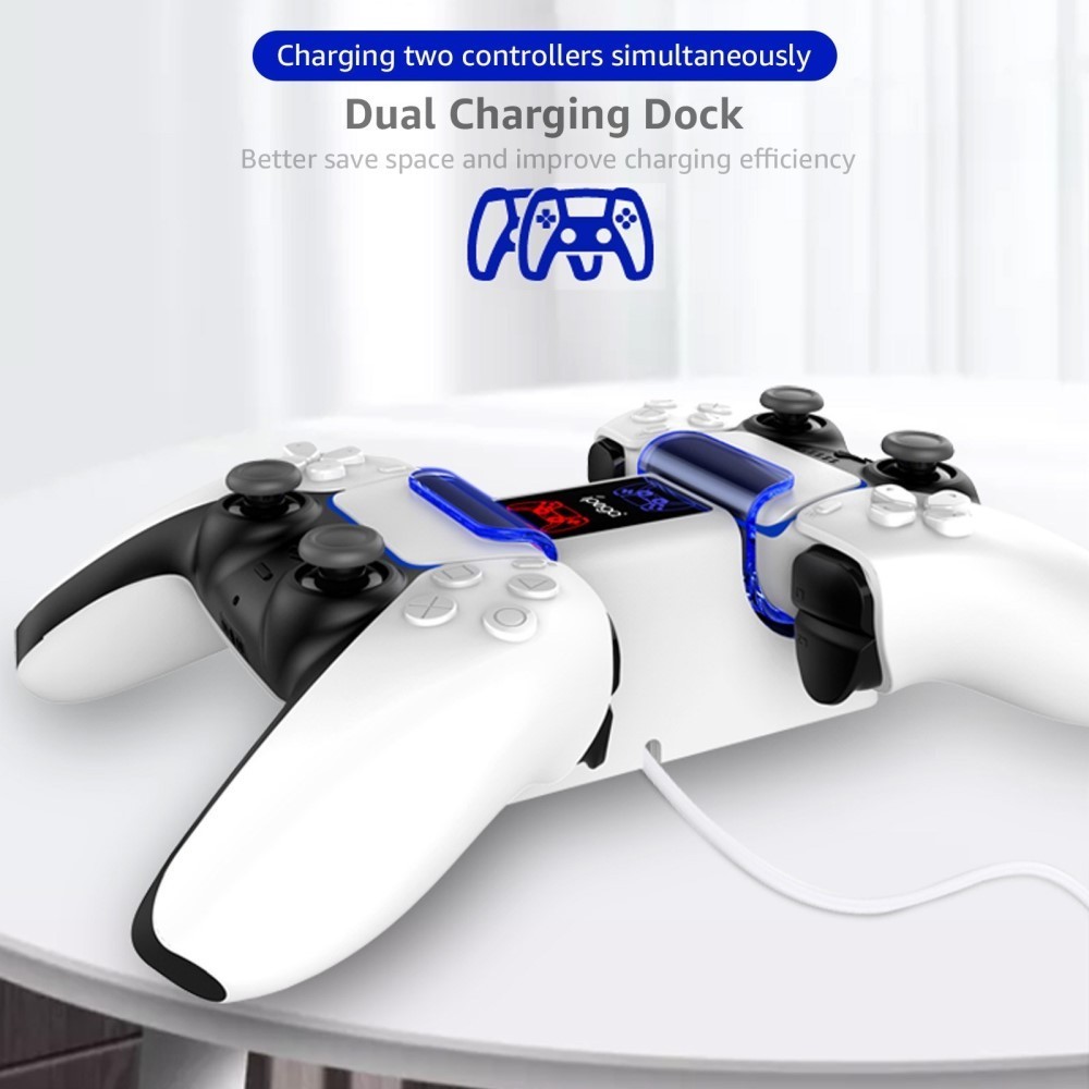 Ladestasjonen støtter lading av to controllere samtidig, med et indicatorlys og et USB-strømkabel på undersiden. Praktisk lading, controllere plasseres på ladestasjonen og kan lades direkte. Indicatorlyset og den lysende basen har funksjoner for ladning og metning, slik at du enkelt kan se ladestatus. Den doble controller-ladingsfunksjonen sparer plass. Lavere ladekabel, USB-strømkabel, enkel å oppbevare når den ikke er i bruk.