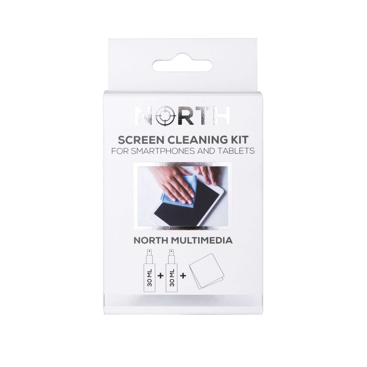 Rengjøringssett for smarttelefoner og nettbrett. Det består av 2 x 30 ml rengjøringssprayer og et mikrofiberklut.