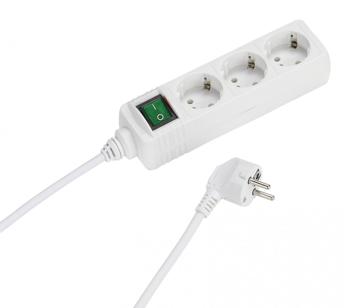 Strømfordeler med 3 jordede stikkontakter som er barnevennlig og har en bryter.