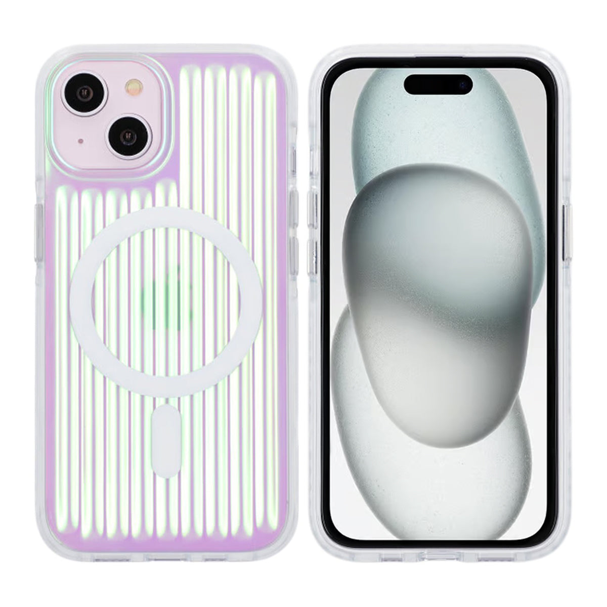 Gi din iPhone 15/14/13 et unikt utseende med dette støtsikre mobildekselet som har en reflekterende iriserende finish med et hint av grønn farge.
