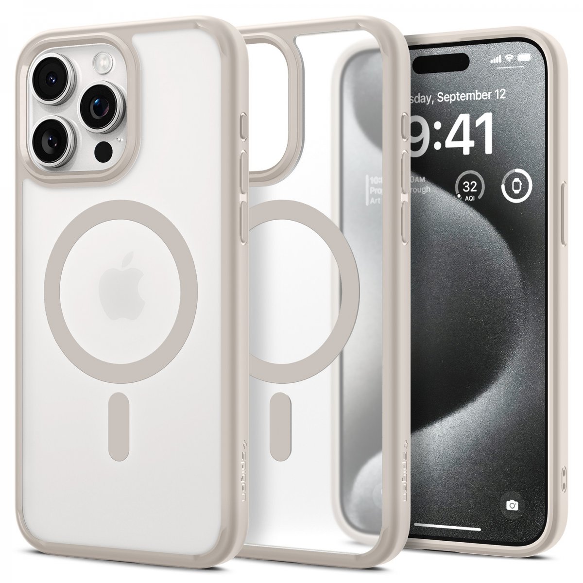 Spigen iPhone 15 Pro Max Skal Ultra Hybrid MagFit Frost Natural Titanium er et grått og gjennomsiktig mobildeksel til iPhone 15 Pro Max.