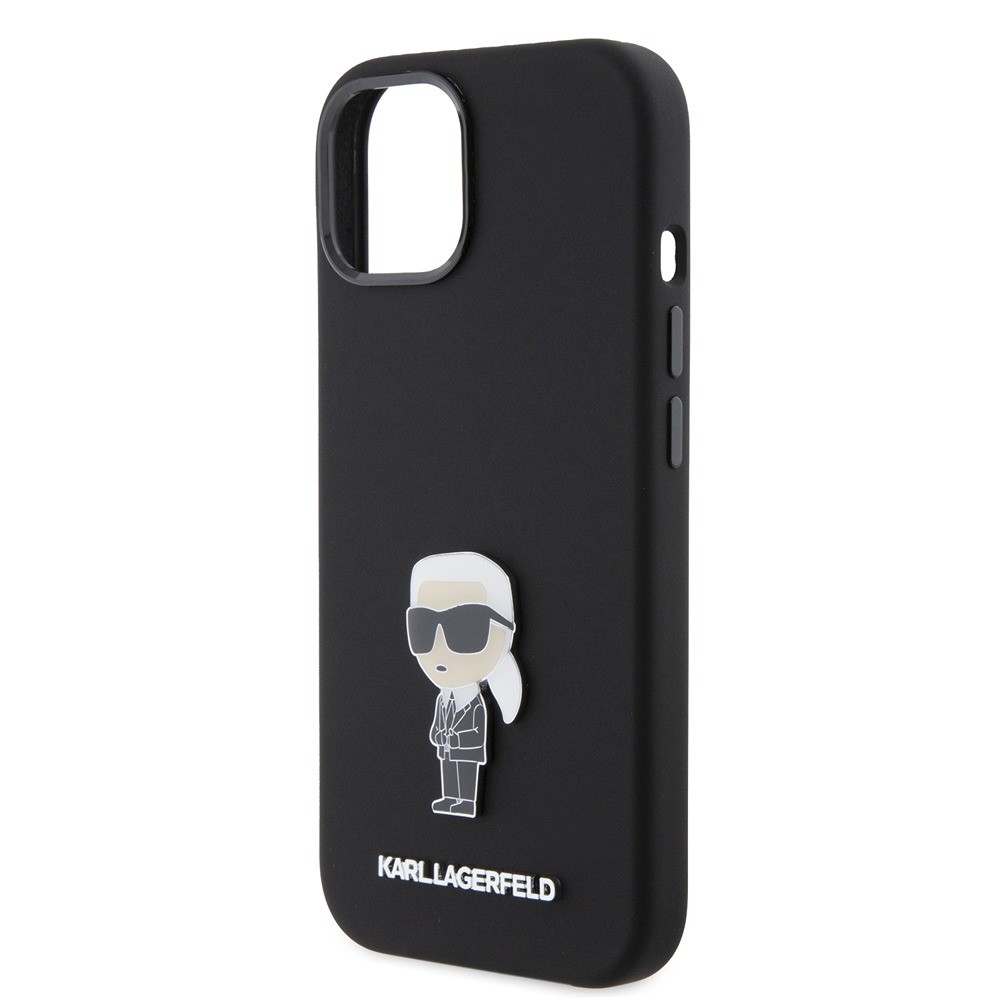 Karl Lagerfeld iPhone 15 Deksel Ikonik Metal Pin Svart er et svart mobildeksel til iPhone 15.