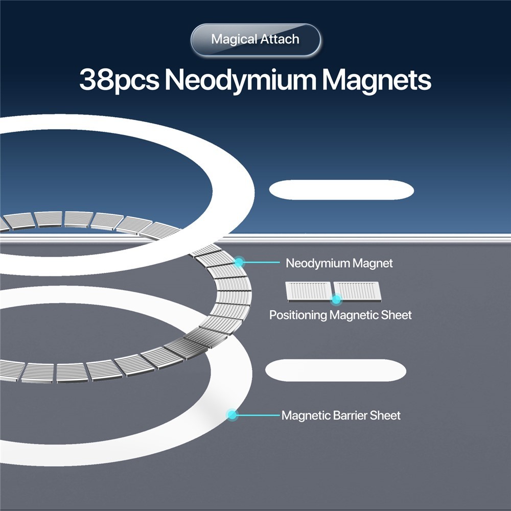 Dekselet har en innebygd magnetring med 38 neodymmagneter og er Magsafe-kompatibelt, noe som gir feste for MagSafe-tilbehør.