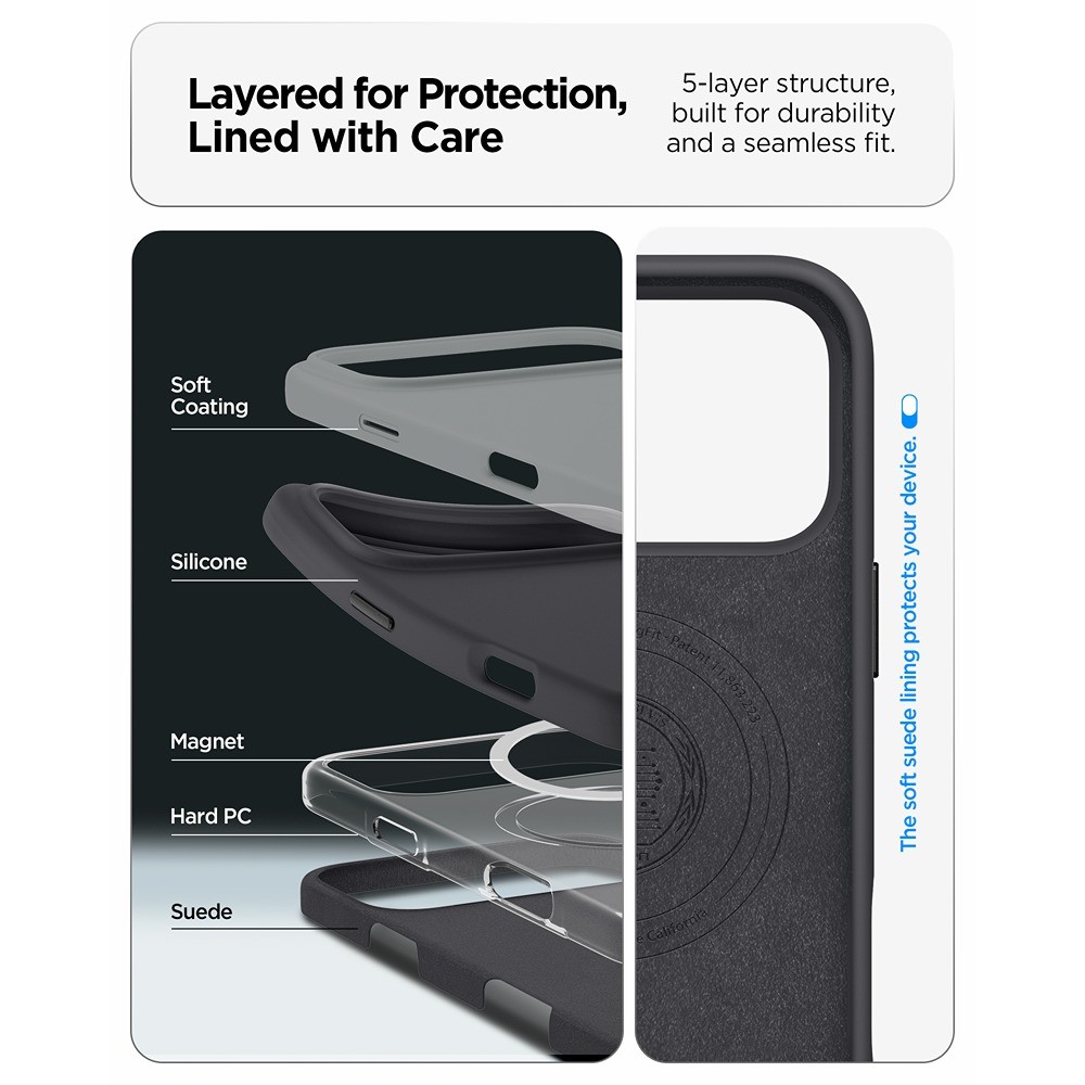 Spigen iPhone 17 Pro Max Skal Silicone Fit MagFit Svart er et svart mobildeksel til Apple iPhone 17 Pro Max.