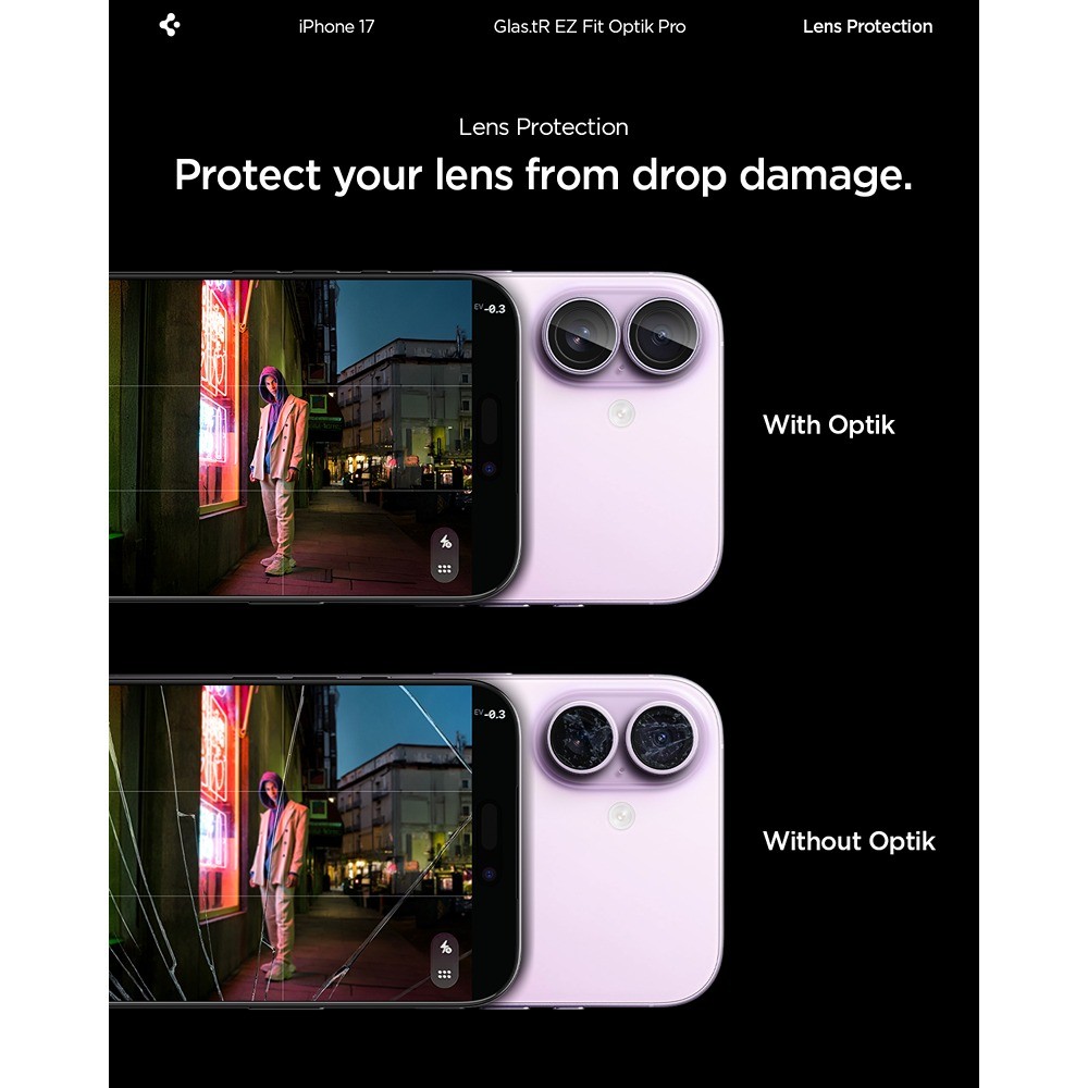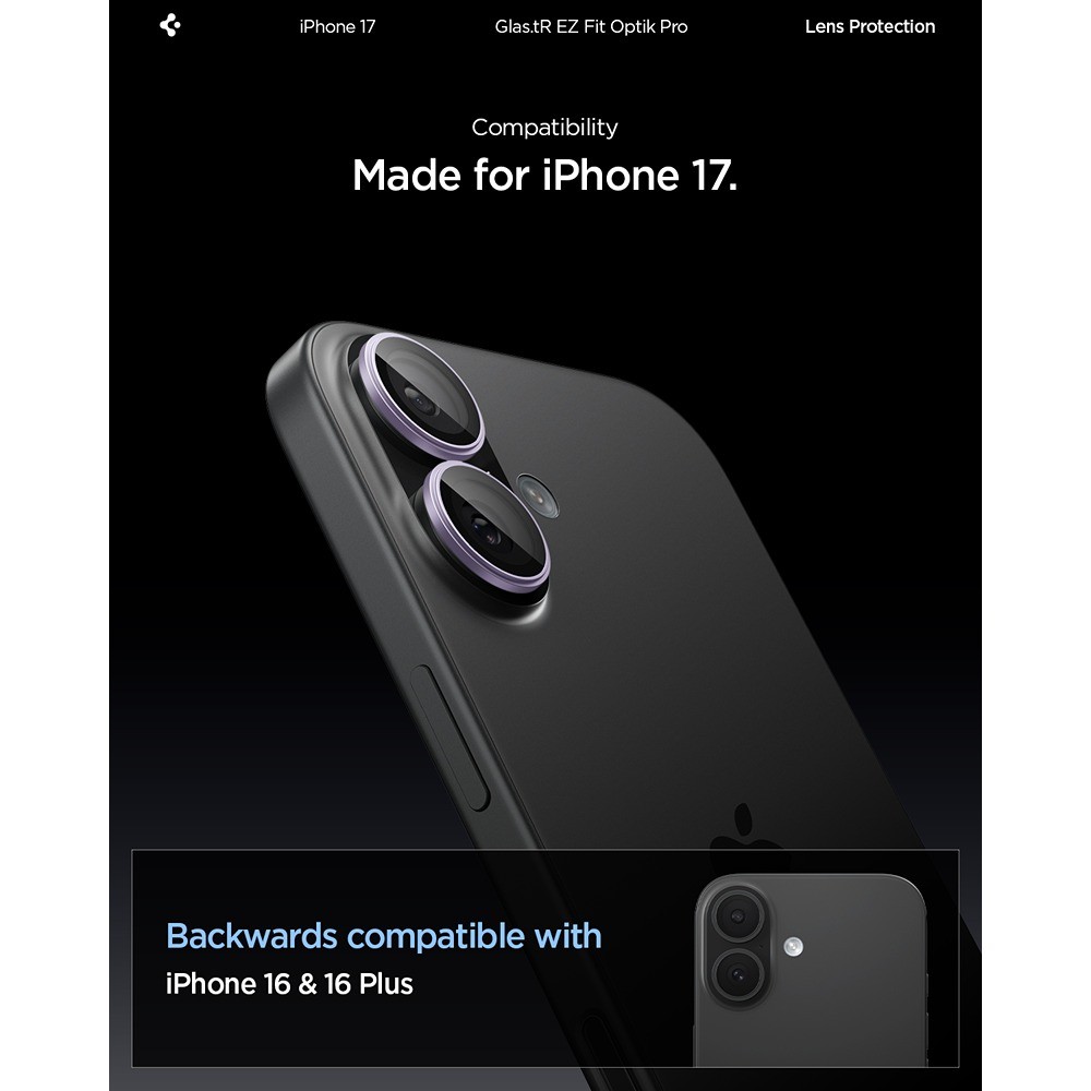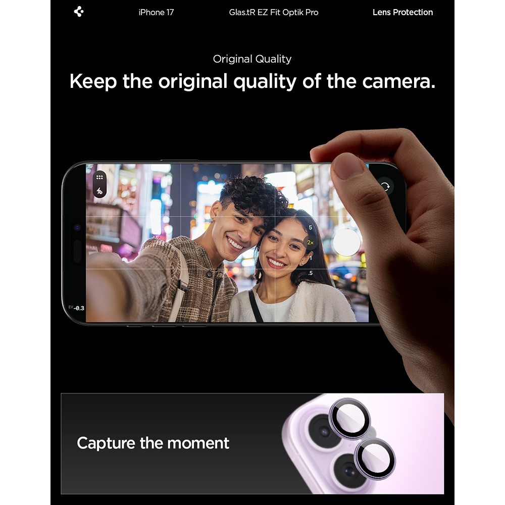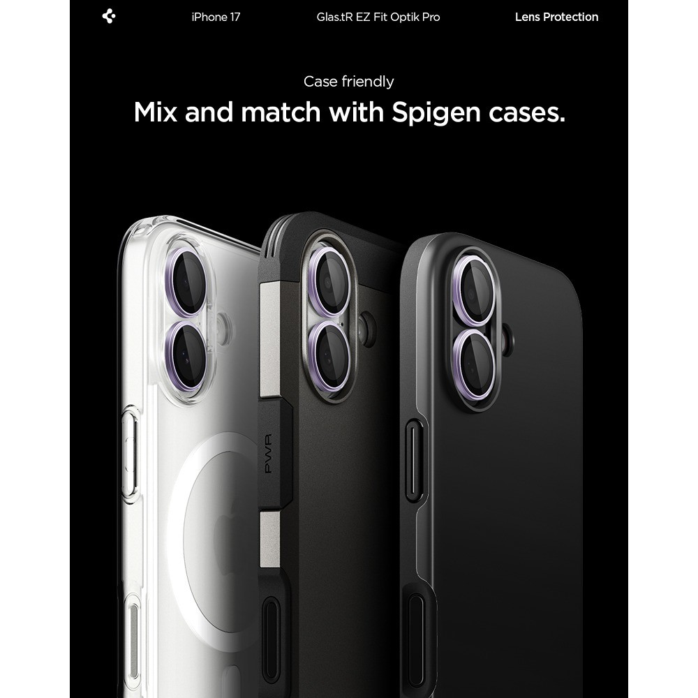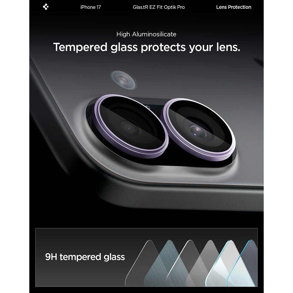 Spigen iPhone 17 Kameraskydd GLAS.tR EZ Fit Optik Pro 2-pack Lila er en lilla og gjennomsiktig kameralinsebeskyttelse til Apple iPhone 17.
