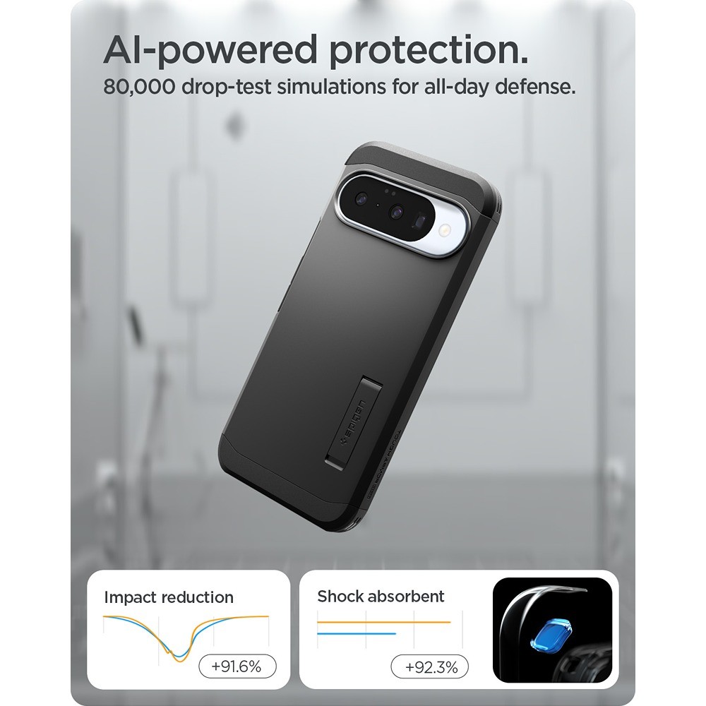 Spigen Google Pixel 10/Pixel 10 Pro Skal Tough Armor MagFit Svart er et svart mobildeksel til Google Pixel 10 og Google Pixel 10 Pro.