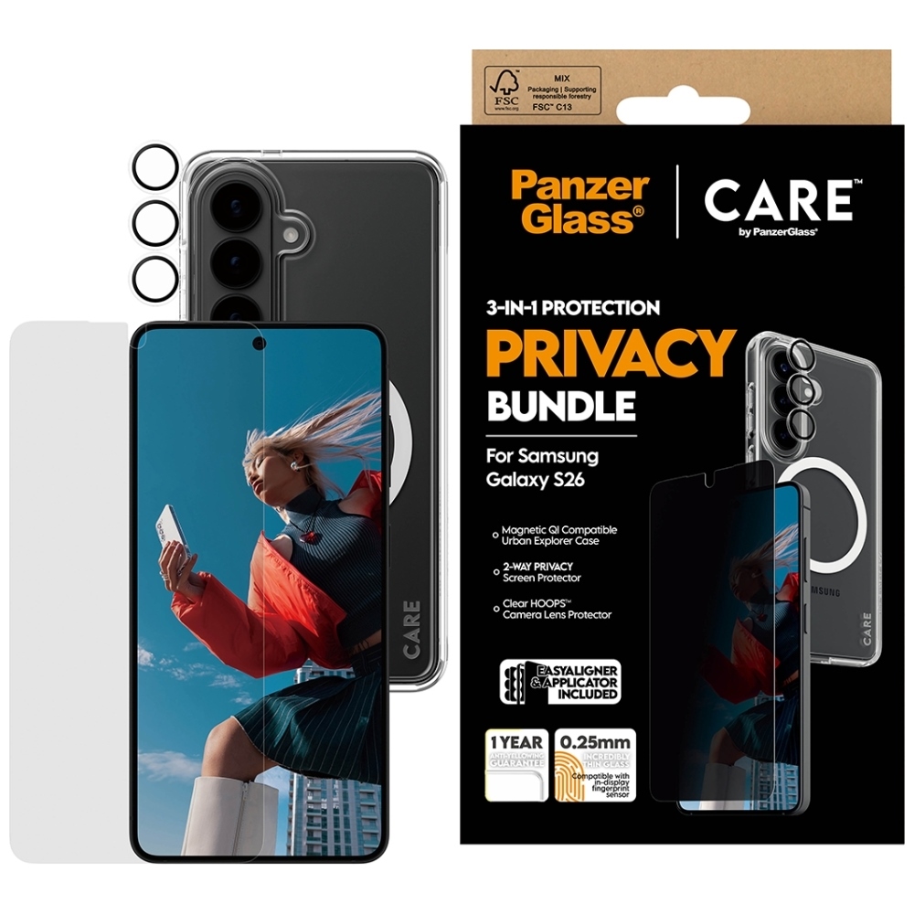 PanzerGlass Samsung Galaxy S26 3-in-1 Protection Privacy Bundle er et gjennomsiktig og svart mobildeksel til Samsung Galaxy S26.