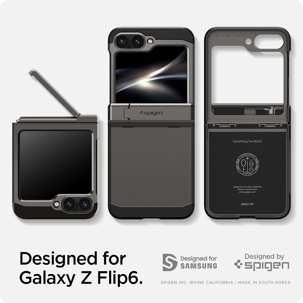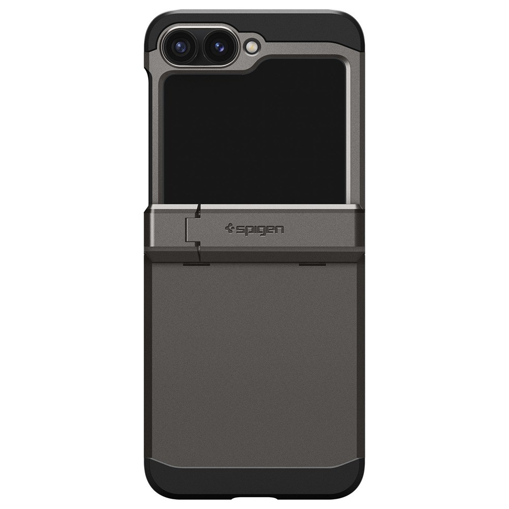 Spigen Samsung Galaxy Z Flip 6/Galaxy Z Flip 7 FE Skal Tough Armor Pro Gunmetal er et grått mobildeksel til Samsung Galaxy Z Flip 6 og Galaxy Z Flip 7 FE.